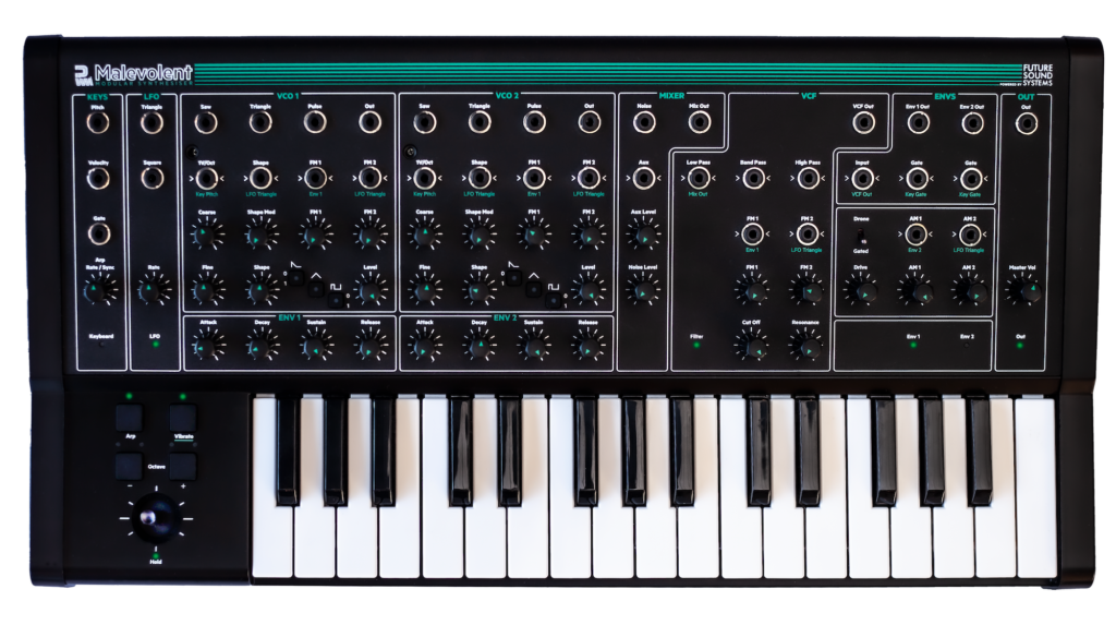 イギリスPWM社のMalevolent(マレヴォレント)は、ミニ32鍵を備えた軽量コンパクトなセミモジュラー・シンセサイザー。現在のツマミ位置そのままの音を出力する純粋なアナログ・シンセで、2VCO、1VCF、2EG、1LFOに加え、ノイズ・ジェネレーターやドライブ回路、アルペジエーターも搭載しており、幅広い音作りを楽しめます。セミ・モジュラーでありながら、2基のオシレーターからそれぞれの波形を個別に出力できたり、相互にピッチやシェイプのモジュレーションを行えるなど、自由度の高い構成が魅力です。
