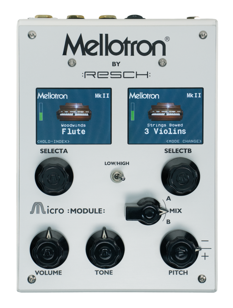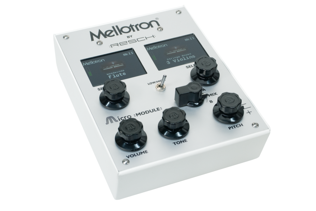 2011年にデジタル・メロトロンとしてM4000Dが発売されて以来、同M4000D Mini、M4000D Rack、Microと、入手しやすいサイズのメロトロンとして復刻された。やはり本家英国から受け継がれた正規ブランド(スウェーデン)による専用機という魅力は大きい。本製品は、Microから鍵盤部分を省いたモジュールの、デジタル・ラインナップ最新版として発売される。サイズ感は分かっていたものの、実際に製品を手にしてみると、ギター用エフェクターのようなコンパクトさに驚く。シグネチャー・カラーである白いケースにアルミのパネル、視認性の高い2系統のTFTカラー液晶に表示されるサンプリング元となった機種のグラフィック表示にワクワクさせられる。